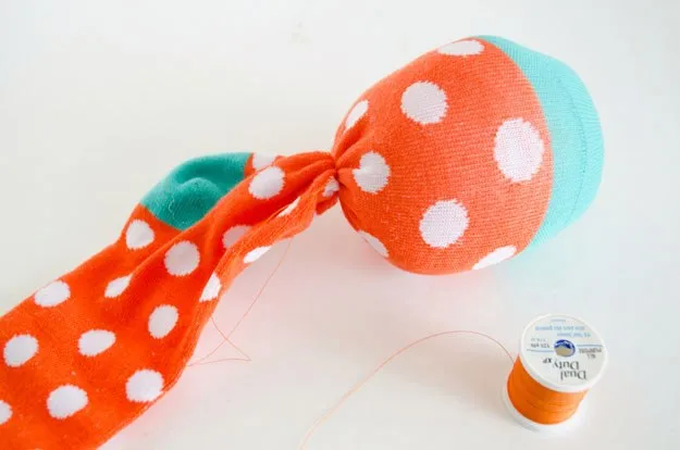 ขั้นตอนที่ 2: ตัดด้ายออกมายาวๆแล้วพันรอบๆใต้ลูกบอลที่ยัดเข้าไปในถุงเท้า จากนั้นก็ทำปมผูกให้แน่นดี ไม่ให้ลูกบอลหลุดออกมา ฉันแนะนำทำปมเล็กๆผูกให้แน่นๆแล้วตัดด้ายส่วนเกินออก