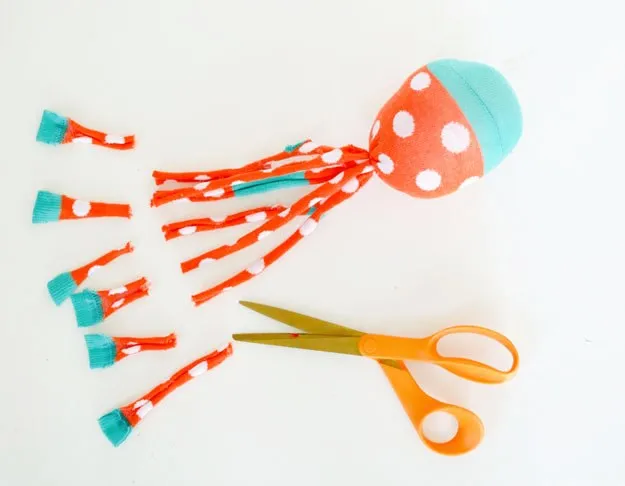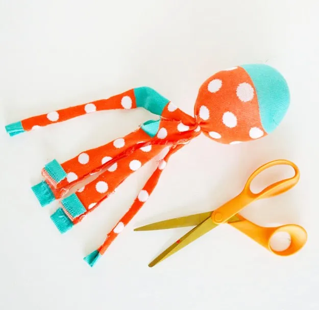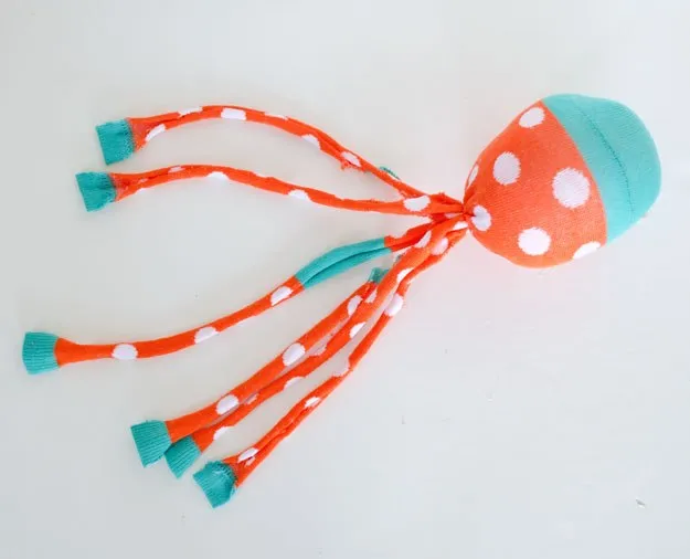 ข้อดีของการทำตุ๊กตาปลาหมึกนี้คือไม่ต้องเย็บ หาถุงเท้าที่มีลวดลายสีสันสดใสมา 1คู่ เพื่อจะทำเจ้าปลาหมึกขี้เล่นด้วยผ้าสักหลาดด้วยการยัดนิดๆหน่อยๆจากนั้นก็เล็มด้วยกรรไกร คุณก็จะได้ปลาหมึกน่ากอดแล้วในไม่กี่นาที