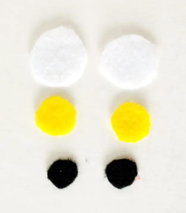 ขั้นตอนที่ 6: ทำดวงตาให้ปลาหมึกของคุณ ใช้ผ้าสักหลาดตัดเป็นวงกลม 3 ขนาด ตัดทั้งหมด 6 วง สีขาวจะเป็นวงที่ใหญ่ที่สุดตามด้วยสีเหลืองและวงที่เล็กที่สุดจะเป็นสีดำ วงกลมสีขาวของฉันมีขนาดเล็กกว่า1นิ้วของเส้นรอบวง ฉันเพียงแค่ตัดวงกลมให้เล็กลงกว่าวงกลมวงก่อน