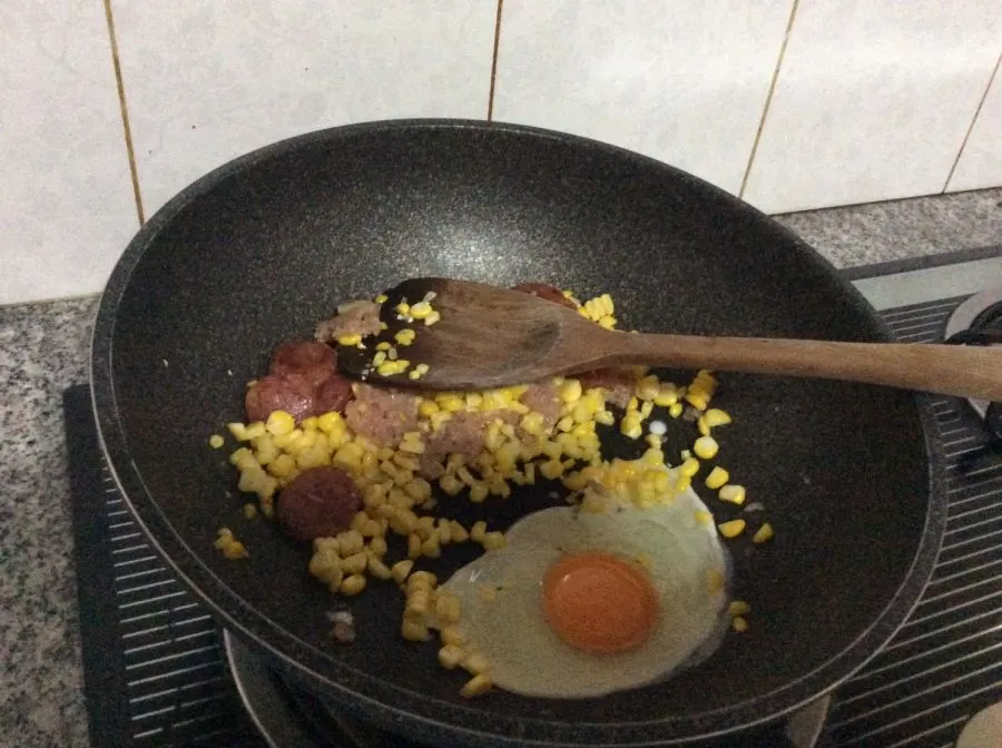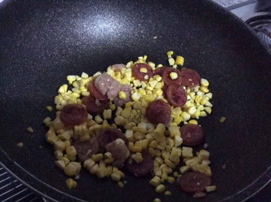 ตั้งกระทะ ไม่ใส่น้ำมัน ใส่กุนเชียง แหนม ข้าวโพด คั่วไฟอ่อนๆค่ะ