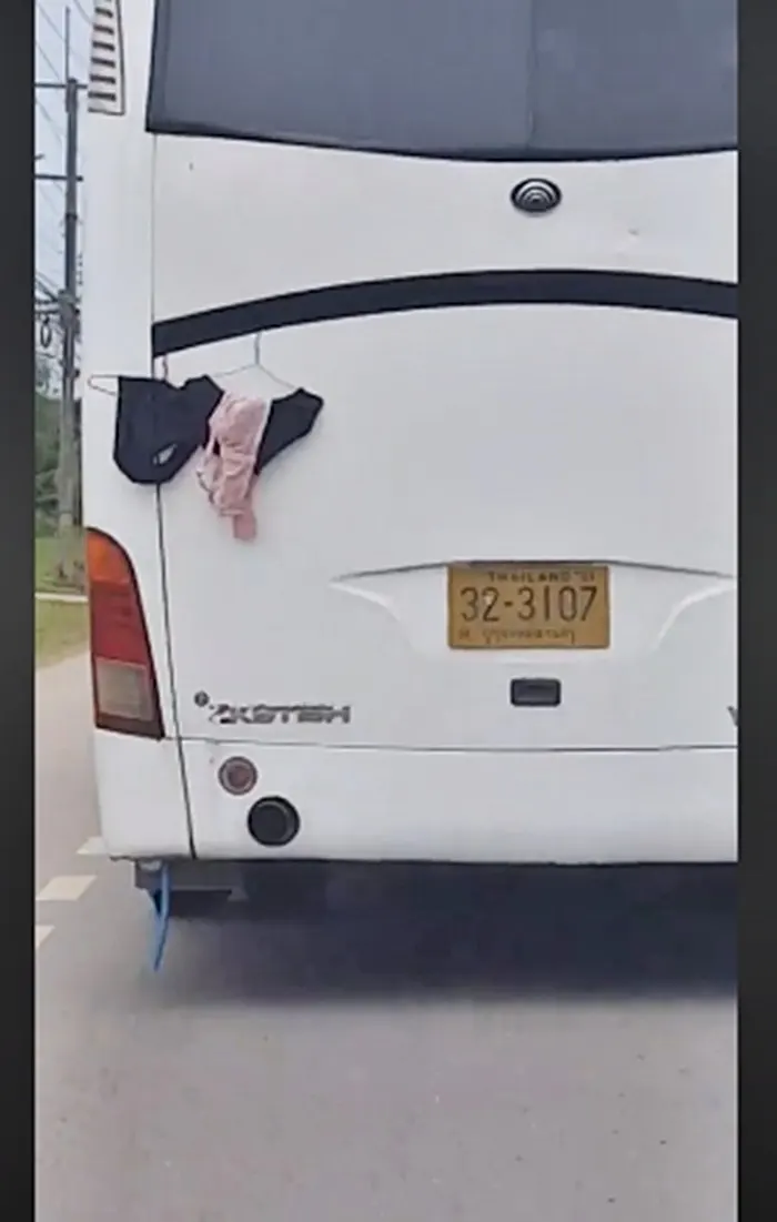 ถึงกับลั่น!! ต้องสะดุดตา กับท้ายรถบัสนำเที่ยว ที่แขวนชุดชั้นในใว้หลังรถ