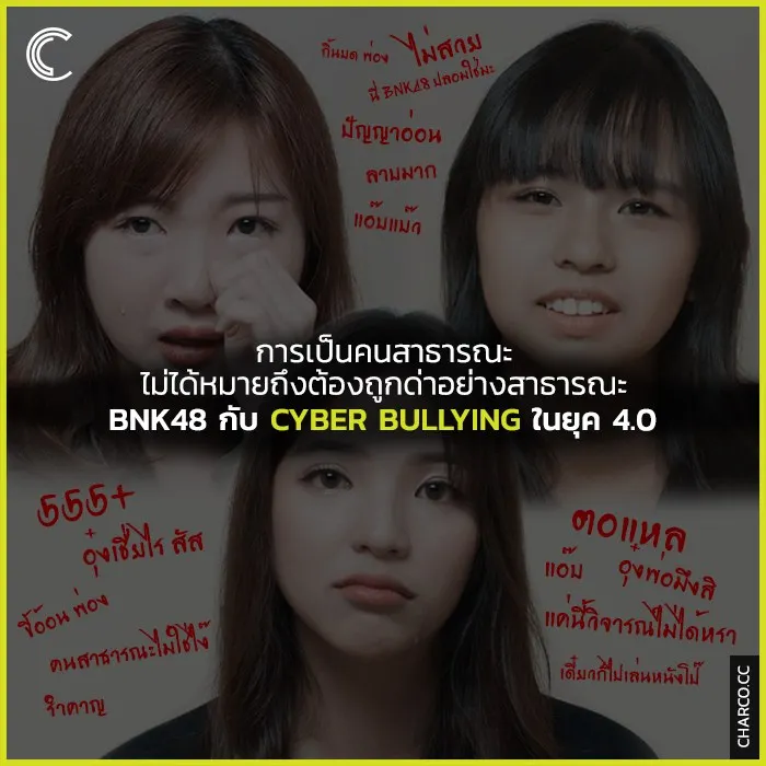 นอกจากคนทั่วไป ดารานักร้องก็ล้วนโดนกลั่นแกล้งกันมามากมาย แต่ถ้าพูดถึงยุคนี้วงที่กำลังมาแรงที่สุดคงหนีไม่พ้น BNK48 เกิร์ลกรุ๊ปเชื้อสายญี่ปุ่นประจำประเทศไทย คนสาธารณะ ยิ่งดัง ยิ่งมีชื่อเสียง ยิ่งถูกวิพากษ์วิจารณ์ มันไม่แปลก แต่ที่น่าสลดคือสิ่งที่พวกเธอได้รับหลาย ๆ ครั้งมันก็แค่การ Bully ที่มาในวลี "เป็นคนสาธารณะไม่ใช่เหรอ แค่นี้วิจารณ์ไม่ได้รึไง"