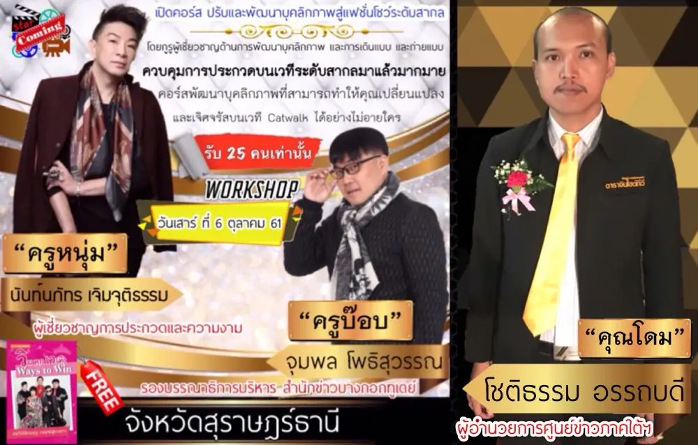นี่คือแรงบันดาลใจที่ผู้อำนวยการศูนย์ข่าวภาคใต้อย่าง “คุณโดม-โชติธรรม อรรถบดี” ที่ต้องการส่งต่อโอกาสให้กับเด็กและเยาวชนไทยในเขตภาคใต้ ในฐานะเป็นชาวใต้ที่นอกจากจะดูแลด้านข่าวสารแล้ว ยังมีความคลุกคลีกับอนาคตของชาติ เพราะได้สร้างสรรค์กิจกรรมดี ๆ เพื่อคนกลุ่มนี้ไว้มากมาย ล่าสุดคุณโดมได้จัดกิจกรรมสานฝันผู้เยาว์ก้าวเข้าสู่วงการบันเทิง ในโครงการ “Workshop Star Coming On Tour” โดยเชิญ 2 กูรูชื่อดัง “ครูหนุ่ม-ประเสริฐ เจิมจุติธรรม” กับ “ครูบ๊อบ-จุมพล โพธิสุวรรณ” ที่มีลีลาการสอนไม่เหมือนใคร ร่วมเติมเต็มและสร้างมูลค่าชีวิตเพิ่มให้กับเด็ก ๆ