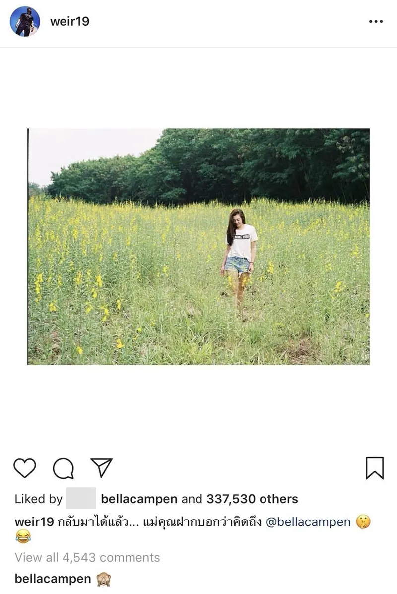 ช่วงนี้สาวเบลล่า งานเยอะเป็นพิเศษ โดยล่าสุดไปงานนาฬิกา OMEGA ที่ประเทศรัสเซีย ทำเอาหนุ่มเวียร์ คิดถึงหนักมากถึงขั้น ประกาศลงใน IG ส่วนตัวพร้อมแทคหาเบลล่า และเบลล่าได้เข้ามาตอบ โดยส่งเป็นรูปอิโมติชั่นรูป ลิงปิดตา ทำเอาเขินกันเป็นแถวเลยงานนี้