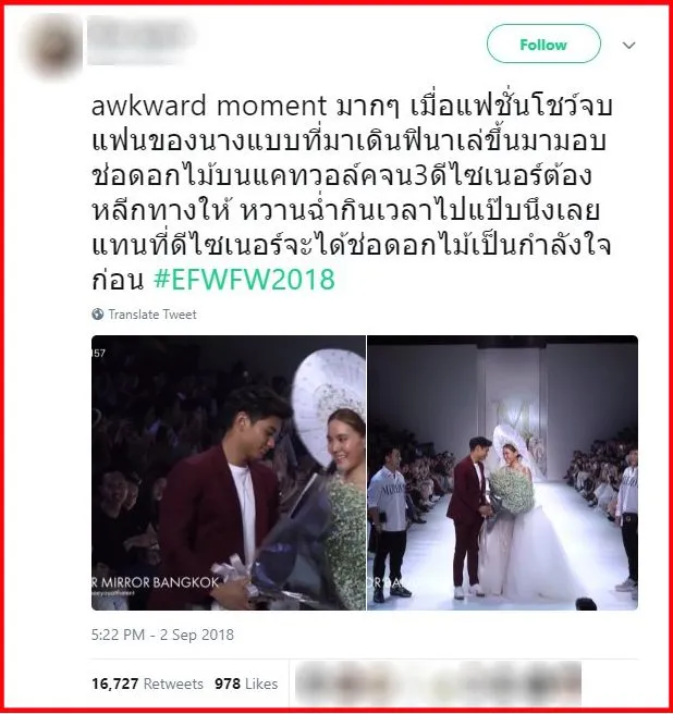 “awkward moment มากๆ เมื่อแฟชั่นโชว์จบ แฟนของนางแบบที่มาเดินฟินาเล่ขึ้นมามอบช่อดอกไม้บนแคทวอล์คจน3ดีไซเนอร์ต้องหลีกทางให้ หวานฉ่ำกินเวลาไปแป๊บนึงเลย แทนที่ดีไซเนอร์จะได้ช่อดอกไม้เป็นกำลังใจก่อน #EFWFW2018”