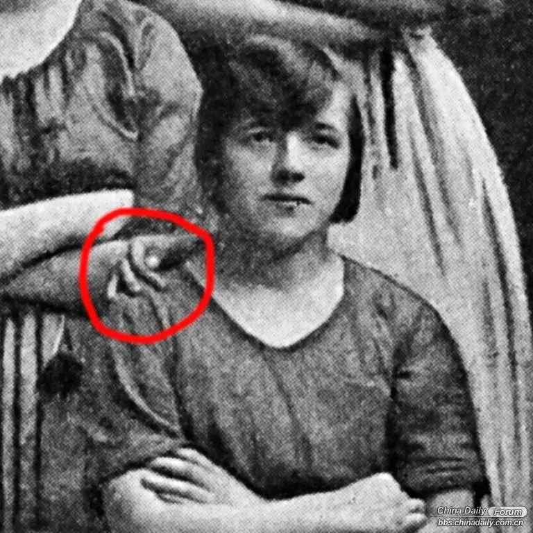 จากภาพจะเห็นว่ามีผู้หญิง 15 คน กำลังนั่งและยืนกอดอกกันอย่างพร้อมเพียง ถ้าคุณมองผู้หญิงที่นั่งอยู่แถวกลางๆ ด้านขวาสุดของภาพ คุณจะเห็นมือปริศนาวางอยู่บนไหล่ขวาของเธอ แล้วมันคือมือของใครล่ะ?