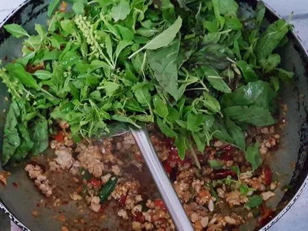 สุดท้ายตามด้วยใบกะเพรา อย่าหวงนะใส่มากๆ ผัดให้หอม