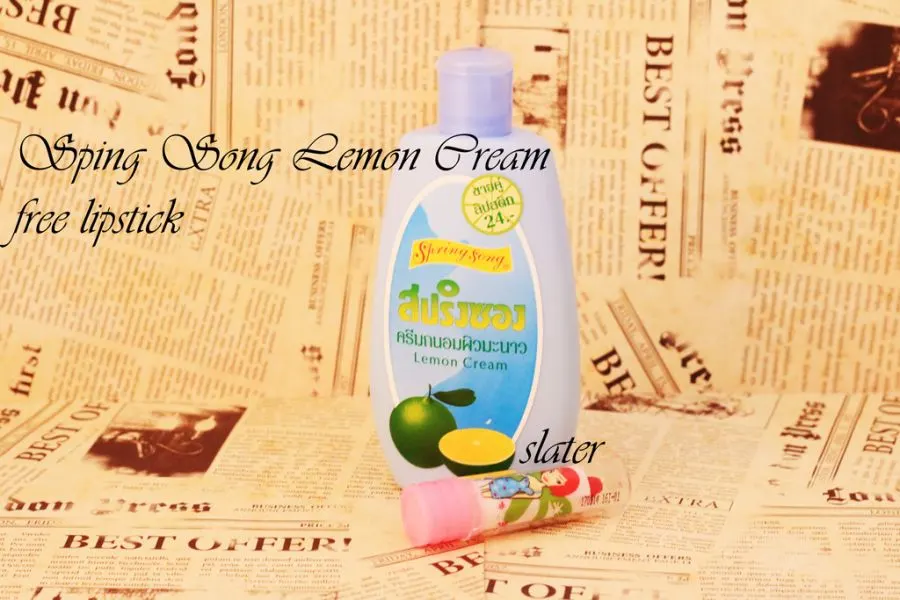 สปริงซองโลชั่นมะนาว (ของแท้ต้องแถมลิปสติค) โลชั่นบำรุงผิวผสมสารสกัดจากมะนาว จากสมัยก่อนที่ใช้มะนาวมาเป็นส่วนผสมในการขัดพอกผิวให้ขาวใส เค้าก็เลยทำโลชั่นนี้ขึ้นมาละมั้งค่ะ แล้วส่วนตัวก็คิดว่าโลชั่นสปริงซองคงเป็นแรงบันดาลให้พวกโลชั่นครีมกวนเองสมัยนี้ใส่อะไรที่เป็นกรดกัดผิวลงไป (ไม่ได้มีเจตนาจะบอกว่าโลชั่นสปริงซองมีส่วนผสมของกรดกัดผิวนะคะ เพียงแต่อาจจะทำให้พวกโลชั่นแปลกสมัยนี้ๆเอามาเป็นแรงบันดาลใจทำอะไรแปลกๆ) โลชั่นตัวนี้ถือว่ากลิ่นหอมดีนะคะ สดชื่นๆแบบมะนาว ทาแล้วไม่แสบผิว ไม่ได้ทำให้ผิวชุ่มชื่นหนักแต่อย่างใด ทาแล้วก็รู้สึกสบายๆผิวอยู่ดีค่ะ จริงๆแบรนด์นี้จะมีแป้งฝุ่นทาตัวด้วยนะคะ แต่หาซื่อไม่เจอค่ะ