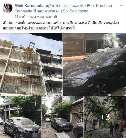 เหตุเกิดวันนี้ (14 ก.ย.61) หลังนักแสดงสาว “มิ้ง - ฐรินดา กรรณสูต” โพสต์เฟซบุ๊ก Mink Karnasuta เป็นรูปรถยนต์ “ฮอนด้า” ที่ได้รับความเสียหายจากเครนล้มทับเสาไฟฟ้า ในซอยศาลาแดง 2 ก่อนที่เครนจะหล่นลงมาฟาดตึก ตกลงมาใส่รถยนต์ส่วนตัวของนักแสดงสาวได้รับความเสียหาย พร้อมเขียนข้อความในเฟซบุ๊กว่า “เกือบตายละมั้ย เครนหล่มจากก่อสร้าง ฟาดตึกมาลงรถ อีกนิดเดียวทะลุห้องนอนละ ขอโทษด้วยนะคะเลยไม่ได้ไปงานวันนี้” ทีมข่าว “ไนน์เอ็นเตอร์เทน” จะรายงานความคืบหน้าต่อไป