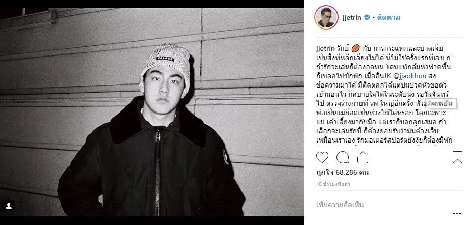 ล่าสุดในไอจี jjetrinรักบี้ กับ การกระแทกและบาดเจ็บเป็นสิ่งที่หลีกเลี่ยงไม่ได้ นี่ไม่ใช่ครั้งแรกที่เจ็บ ก็ถ้ารักจะเล่นก็ต้องอดทน โดนแท๊กล้มหัวฟาดพื้น ก็เบลอไปซักพัก เมื่อคืนJK @jjaokhun ส่งข้อความมาได้ มีติดตลกได้แต่บ่นปวดหัวขอตัวเข้านอนไว ก็สบายใจได้ในระดับนึง รอวันจันทร์ไป ตรวจร่างกายที่ รพ ใหญ่อีกครั้ง หัวอกคนเป็นพ่อเป็นแม่ก็อดเป็นห่วงไม่ได้หรอก โดยเฉพาะแม่ เค้าเลี้ยงมากับมือ แต่เราก็บอกลูกเสมอ ถ้าเลือกจะเล่นรักบี้ ก็ต้องยอมรับว่ามันต้องเจ็บ เหมือนเราเอง รักมอเตอร์สปอร์ตยังงัยก็ต้องมีหัก ส่วนหลังจากนี้ เค้ายังจะเล่นต่อไปหรือไม่ก็อยู่ที่การตัดสินใจของเค้าเอง #GetWellSoonJK #jjetrin