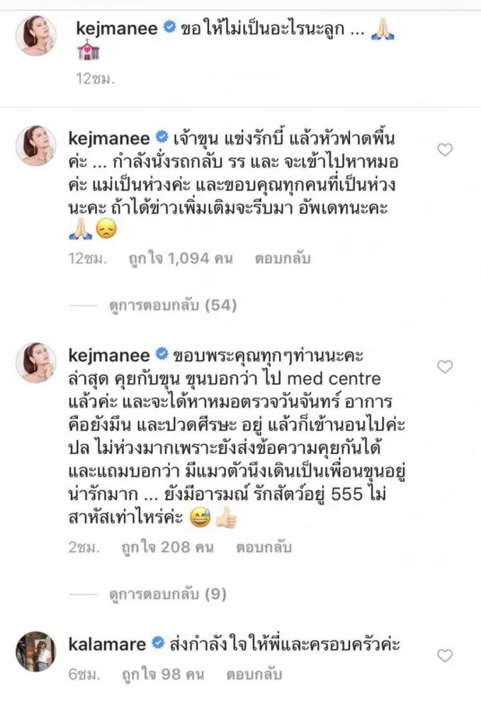หลังจากนั้นมีแฟนคลับจำนวนมากเข้ามาคอมเมนต์แสดงความเป็นห่วงเป็นใย พร้อมกับภาวนาให้น้องเจ้าขุนปลอดภัย ล่าสุดปิ่น เก็จมณี ได้ตอบคอมเมนต์ขอบคุณทุกความห่วงใย พร้อมอัพเดทอาการของน้องเจ้าขุน ขอบพระคุณทุกๆ ท่านนะคะ ล่าสุดคุยกับขุน ขุนบอกว่า ไป med center แล้วค่ะ และจะได้หาหมตรวจวันจันทร์ อาการคือยังมึน และปวดศรีษะอยู่ แล้วก็เข้านอนไปค่ะ ปล.ไม่ห่วงมาก เพราะยังส่งข้อความคุยกันได้ และแถมบอกว่า มีแมวตัวหนึ่งเดินเป็นเพื่อนขุนอยู่ น่ารักมาก ยังมีอารมณ์ รักสัตว์อยู่ 555 ไม่สาหัสเท่าไรค่ะ”