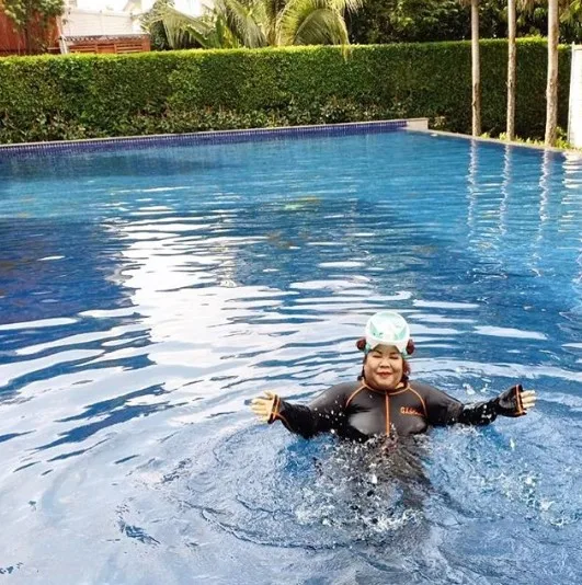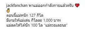 โดยแจ๊ค ได้โพสต์ภาพขณะที่คุณแม่อยู่ในสระว่ายน้ำ พร้อมกับข้อความบรรยายว่า "พาแม่ออกกำลังกายแล้วครับ ตอนนี้แม่หนัก 127 กิโล มีเกมให้แม่เล่น กิโลละ 1,000 บาท แม่ลดให้ได้สัก 100 โล แม่รวยเลยนะ"
