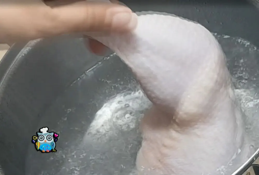3.ตั้งน้ำให้เดือดใส่ไก่ลงไปต้มพอแต่ผิวไก่ตึงๆ เป็นการลวกทำความสะอาด ตักไก่ขึ้นผ่านน้ำเย็นแล้วตักขึ้นพักไว้