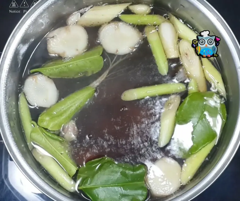 4.ตั้งน้ำใหม่ ใส่ข่า ตะไคร้ กระเทียม รากผักชี ใบมะกรูด ปรุงรสด้วยซีอิ้วขาว ซอสปรุงรส น้ำตาลปี๊บ ซีอิ้วดำ