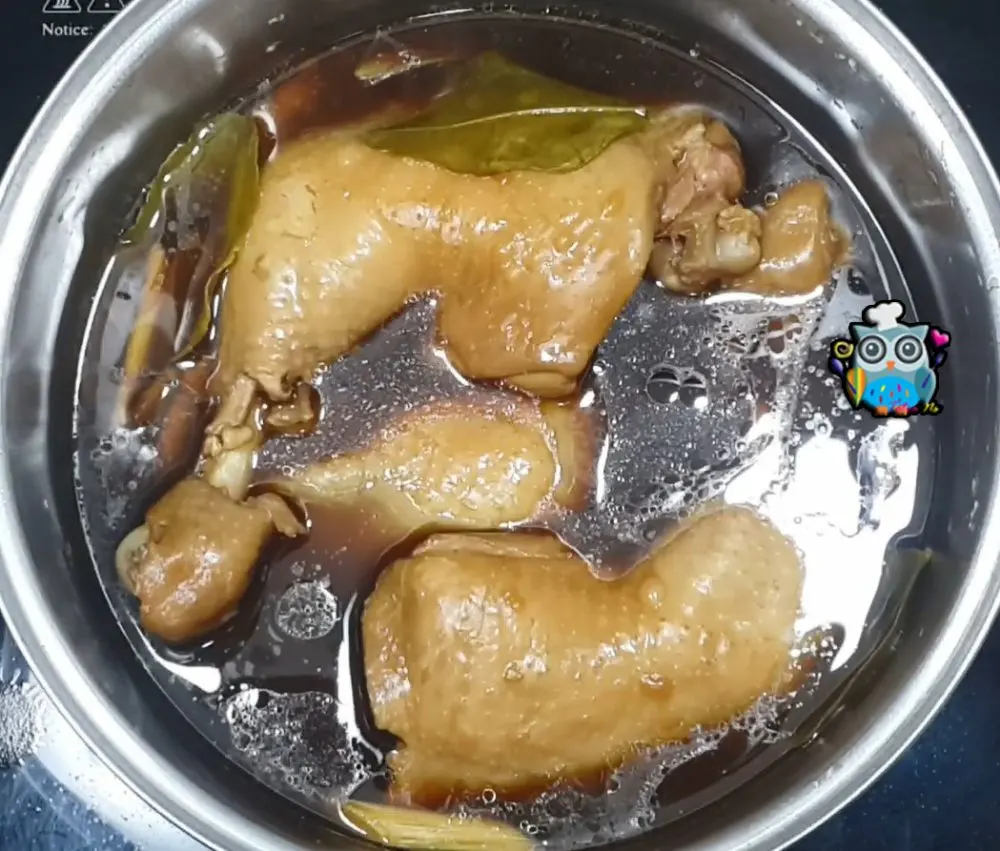 ปิดฝาต้มประมาณ 40 นาที น้ำจะงวดลงเนื้อไก่เปื่อยนุ่มกำลังดี ถ้าเค็มไปเติมน้ำเปล่าเพิ่มได้