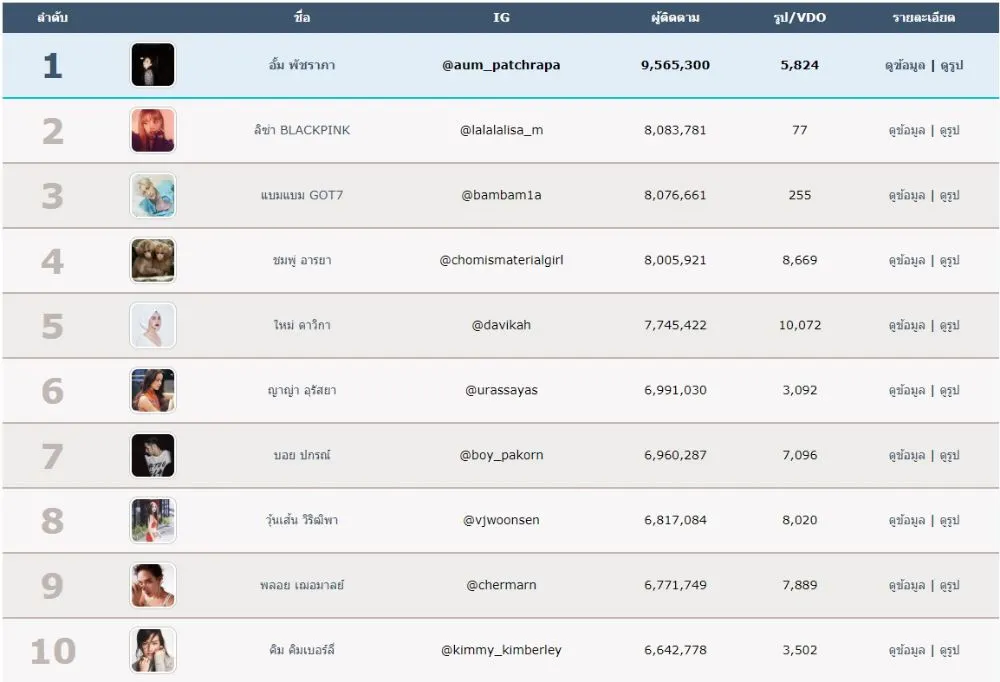 อั้ม พัชราภา ถือว่าครองอันดับ 1 บน Instagram เมืองไทยมายาวมากนับตั้งแต่เปิดใช้ Instagram ยุคแรกๆ ทั้งยังเป็นคนไทยคนแรกที่ยอดฟอลโล่แตะหลักล้านคนแรก จนถึง 9 ล้านคนแรกของไทยอีกด้วย ก็ขอให้สาวอั้มทำสถิติ 10 ล้านคนแรกที่เป็นคนไทยก่อนนะจ้ะหนูลิซ่า ค่อยขยับขึ้นมา ^_^