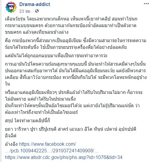 เพจ Drama Addict เตือน!! ใช้กระป๋องทอดไข่แบบเด็กหอ อันตราย!เสี่ยงเป็นอัลไซเมอร์!