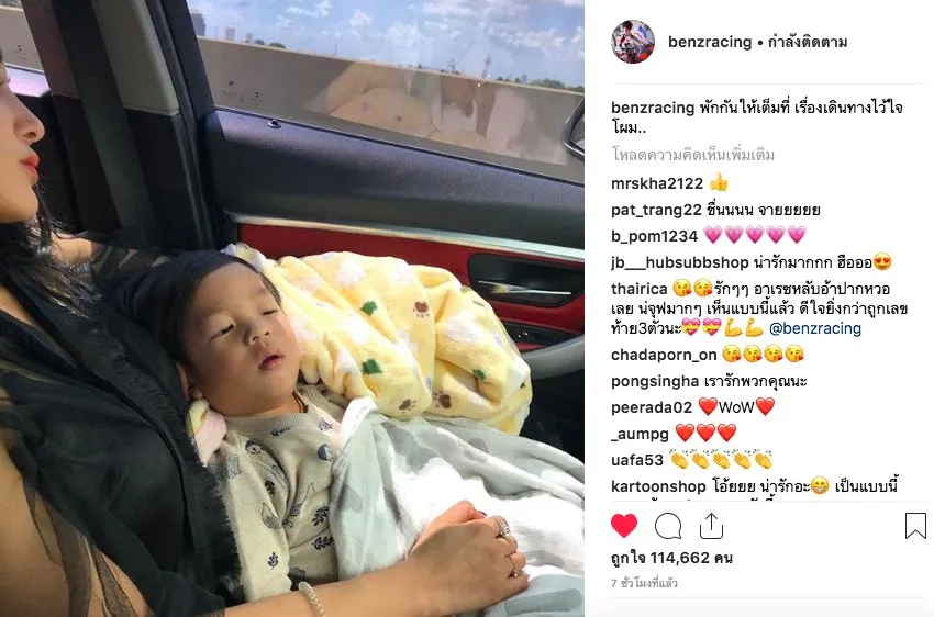 ล่าสุด “เบนซ์ เรซซิ่ง” ออกมาโพสต์ภาพเเม่เเพทเเละน้องเรซซิ่ง พร้อมแคปชั่นที่ระบุว่า “พักกันให้เต็มที่ เรื่องเดินทางไว้ใจโผม..” ซึ่งต้องบอกเลยว่าเห็นภาพแพทและลูกอยู่ในช็อตนี้ก็ต้องบอกเลยว่าน่ารักมากๆเลยทีเดียว เห็นแล้วก็ต้องอิจฉากันหนักมากเลยทีเดียว