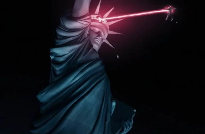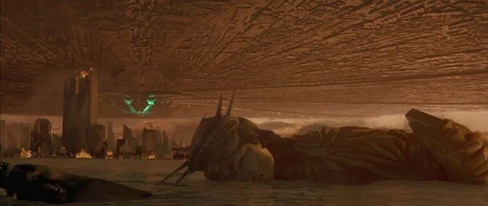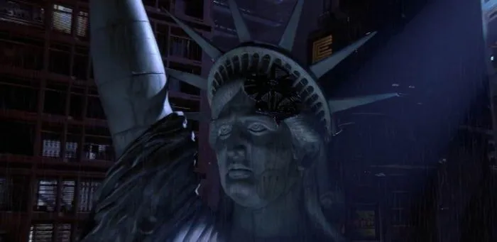 หรือที่รู้จักกันในชื่อ ID4 สุดยอดหนังเกี่ยวกับมนุษย์ต่างดาวในยุค 90 ที่ประทับใจใครหลายๆ คนจนมาถึงทุกวันนี้ และจุดจบของเทพีเสรีภาพในเรื่องนี้ก็ไม่มีอะไรนอกจากโดยมนุษย์ต่างดาวถล่มตามสูตร เรียกได้ว่าใบหน้าของเธอต้องลงมาแนบกับผืนน้ำในแม่น้ำอย่างน่าสงสารจริงๆ
