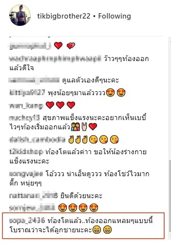 มีแฟนคลับพากับมาคอมเมนต์เริ่มคาดเดาเพศของศรรามจูเนียร์ คาดเดาตามความเชื่อโบราณ ว่าท้องแหลมจะได้ลูกชาย