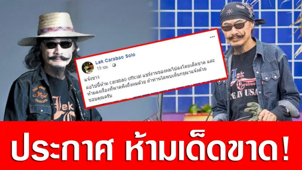 เป็นประเด็นร้อนขึ้นมาทันที เมื่อนักดนตรีชื่อดัง ‘เล็ก คาราบาว’ ได้โพสต์ข้อความผ่านเฟซบุ๊ก ว่า แจ้งข่าว ต่อไปนี้ห้าม carabao official แชร์งานของผมไปลงโดยเด็ดขาด และห้ามลงเรื่องที่พาดพิงถึงผมด้วย ถ้าท่านใดพบเห็นกรุณาแจ้งด้วย ขอบคุณครับ งานนี้ เล่นเอาแฟนคลับงงหนักมาก
