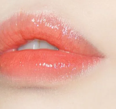 ทาลิปสติกสีส้มพีชบริเวณกลางปากเกลี่ยให้ฟุ้งๆตบด้วยลิปกลอสใสตาม