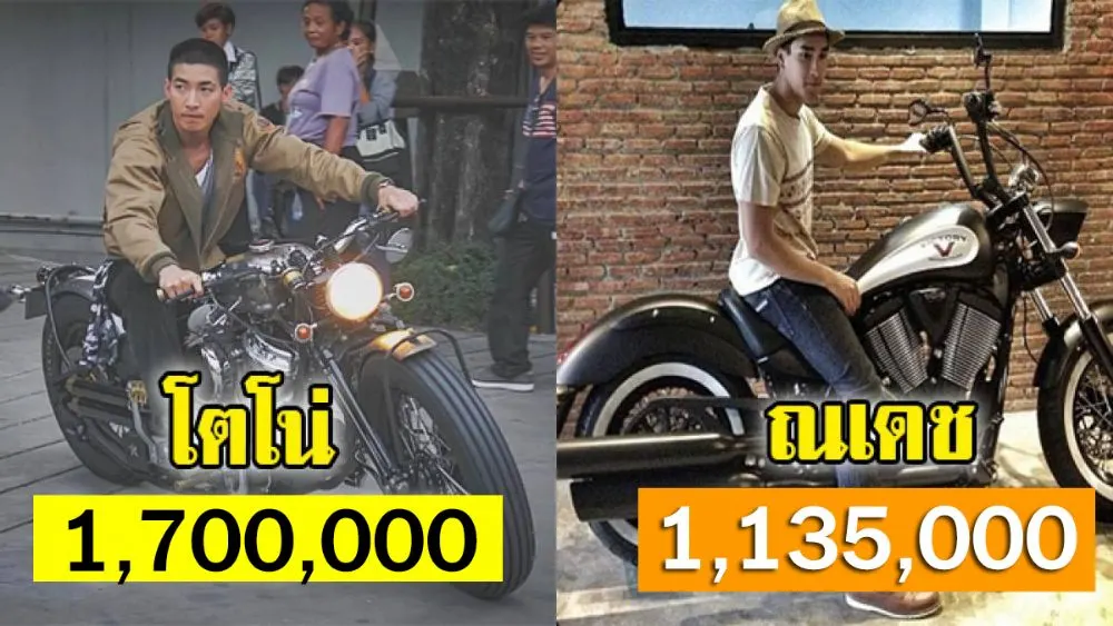 ปิดท้ายที่พระเอกซุปตาร์สุดฮอต ขวัญใจมหาชนชาวไทยอย่าง ณเดชน์ คูกิมิยะ น้อยคนจะรู้ว่า หนุ่มณเดชน์ ก็ชื่นชอบรถบิ๊กไบค์ไม่ใช่น้อยเหมือนกัน แถมที่มีอยู่ในสต็อกยังมีราคาหลักล้านอีกต่างหาก รถก็หล่อคนก็หล่อ คันนี้มาพร้อมสไตล์ครูสเซอร์ Victory High-Ball กับเครื่องยนต์ถึง 1,731 cc แต่หากจะพูดเรื่องราคาแสนสูงที่เจ้าตัวขนหน้าแข้งไม่มีวันร่วง ซึ่งบิ๊กไบค์คู่ใจรุ่น Victory High-Ball คันนี้ ราคาอยู่ที่ 1,135,000 บาทค่าา