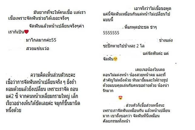 งานนี้หลังสาวใบเตยโพสต์ภาพและข้อความดังกล่าวลงไป ก็มีแฟนๆเข้ามาคอมเม้นต์แสดงความคิดเห็นถึงเรื่องนี้กันอย่างมากมาย โดยส่วนใหญ่มีทั้งคนที่เชื่อและไม่เชื่อว่าสาวใบเตยไม่เคยพึ่งมีดหมอศัลยกรรมมา แต่เจ้าตัวก็ได้ออกมายืนยันหลายครั้งแล้วว่าไม่ได้ทำจริงๆ แฟนคลับต่างชื่นชมว่าเธอสวยขึ้นเป็นกองจริงๆ ต้องยอมรับว่าเธอคนนี้ทั้งความสวยและความสามารถของเธอไม่แพ้กันเลยทีเดียว