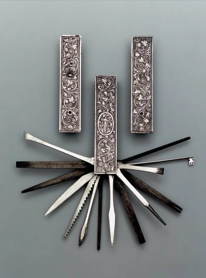 9. เครื่องมือโบราณสารพัดประโยชน์กลายกับมีดสวิสในปัจจุบัน จากนูเริมเบิร์ก ในสมัยศตวรรษที่ 16