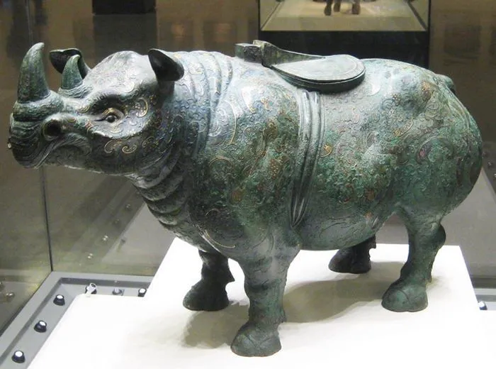13. โถบรรจุไวน์ที่มีรูปทรงเป็นแรด จากราชวงศ์ฮั่น ประเทศจีน เมื่อประมาณ 2,100 ถึง 2,300 ปีก่อน