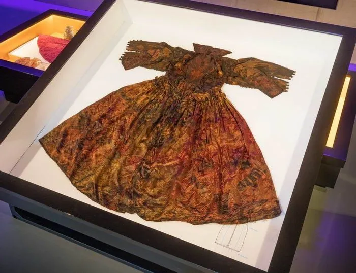 21. ชุดเดรสผ้าไหมลวดลายดอกไม้ที่มีอายุกว่า 400 ปีตัวนี้ ถูกกู้ขึ้นมาได้จากซากเรือก้นมหาสมุทรในเนเธอร์แลนด์