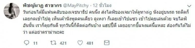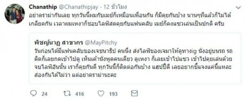 ขณะที่ทาง “เจ ชนาธิป” ก็ได้รีทวิตสาวเมย์ พร้อมบอกว่า อย่าดราม่ากันเลย ทุกวันนี้ผมกับเมย์ก็เหมือนเพื่อนกัน มีคุยกันบ้าง นานๆ ที แล้วก็ไม่ได้เกลียดกัน เวลาตนเหงาก็จะไลฟ์คุยกับแฟนคลับ เมย์ก็คงแซวเล่นเป็นปกติ
