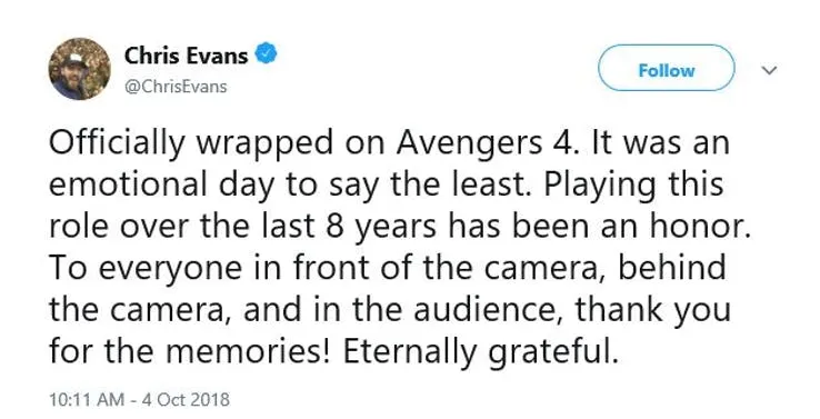 ลายคนรู้กันอยู่แล้วว่า Avengers 4 จะเป็นจุดสิ้นสุดของอะไรหลาย ๆ อย่าง นอกจากจะเป็นเรื่องราวการเดินทางของจักรวาลภาพยนตร์มาร์เวลกว่า 10 ปีแล้ว ยังเป็นจุดสิ้นสุดของสัญญานักแสดงทีมหลักอีกด้วย พวกเขาหลายคนเดินทางมาสู่จุดอิ่มตัว และพร้อมจะส่งต่อหน้าที่ให้กับทีมฮีโร่รุ่นใหม่ โดยก่อนหน้านี้คริส แฮมส์เวิร์ธ เองก็ได้ประกาศแล้วว่าเขาได้ถ่ายทำ Avengers 4 เสร็จสิ้นเป็นที่เรียบร้อย นั่นหมายถึงว่าบทบาทของเขาในฐานะ ธอร์ เทพเจ้าสายฟ้าก็สิ้นสุดลงเช่นกัน คราวนี้ถึงคิวของคริส อีแวนส์ ที่ล่าสุดได้โพสต์ผ่านทวิตเตอร์ส่วนตัว (@ChrisEvans) แล้วว่า บทบาทของเขาในฐานะ Captain America ก็ได้สิ้นสุดลงแล้วเช่นกัน