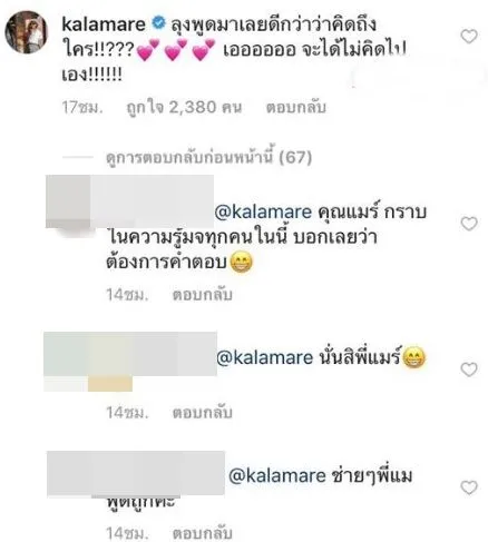 ทำเอากองเชียร์อย่าง “กาละแมร์ พัชรศรี” ทนดูไม่ไหว !! เข้ามาคอมเม้นท์เลยว่า พูดมาเลยดีกว่าว่าคิดถึงใคร ?