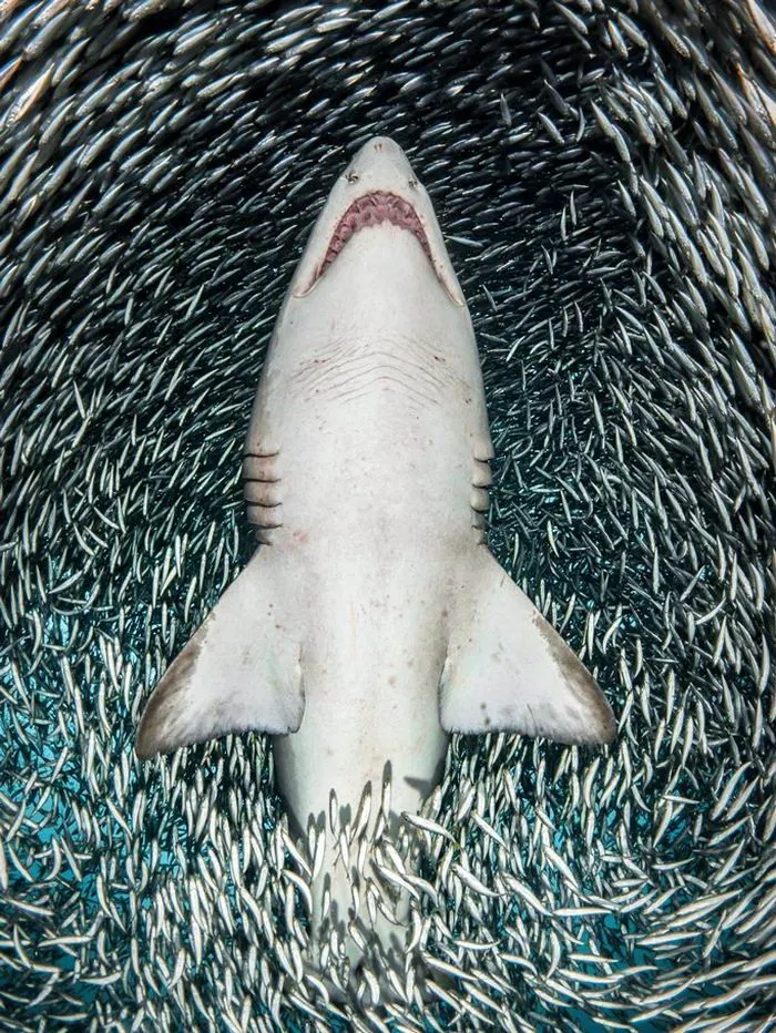 7. ฉลามเสือท่ามกลางฝูงปลาเล็กปลาน้อยจำนวนมาก บริเวณชายฝั่งนอร์ท แคโรไลนา