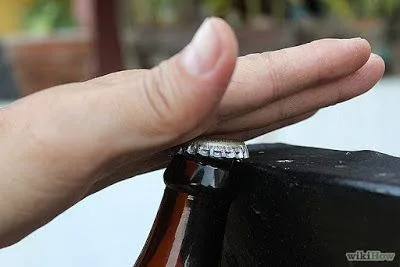 4. นำฝาขวดมาขัดไว้กับขอบมุมต่างๆ ที่เป็นโลหะแล้วใช้มือกระแทกลงไป แต่ห้ามใช้ขอบไม้เด็ดขาด