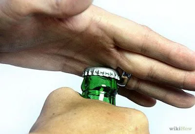 :ใช้แหวนโลหะงัดโดยคว่ำฝ่ามือลงแล้วนำขอบแหวนมาขัดกับขอบฝาขวดและดึงฝาออกมา