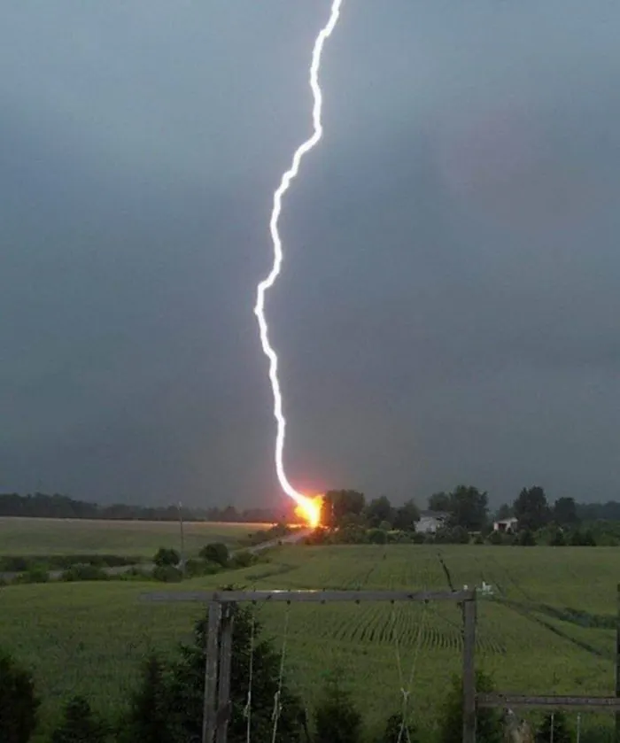 4. ภาพถ่ายที่จับได้พอดิบพอดี ในขณะที่สายฟ้าผ่าลงมาที่ต้นไม้ต้นหนึ่งจนเกิดไฟไหม้
