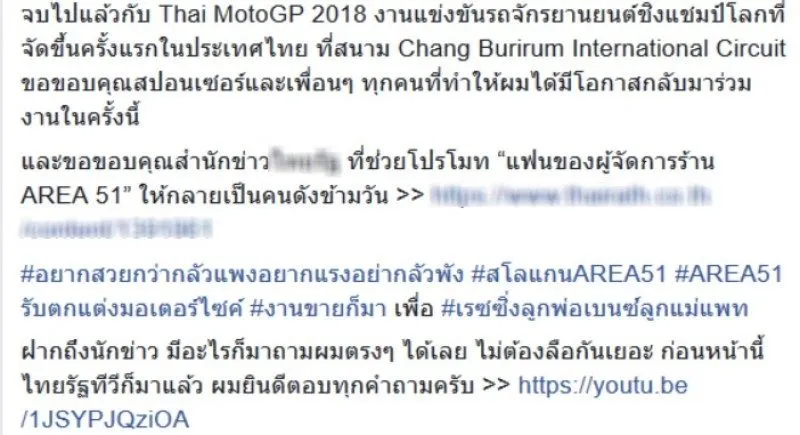 ขอบคุณทุกๆ ฝ่ายที่ทำให้กลับมาแข่งรถ และขอบคุณ “สื่อ” ที่ช่วยโปรโมท “แฟนของผู้จัดการร้าน AREA 51” ให้กลายเป็นคนดังข้ามวัน มีอะไรก็ถามตรงๆ ยินดีตอบทุกคำถาม