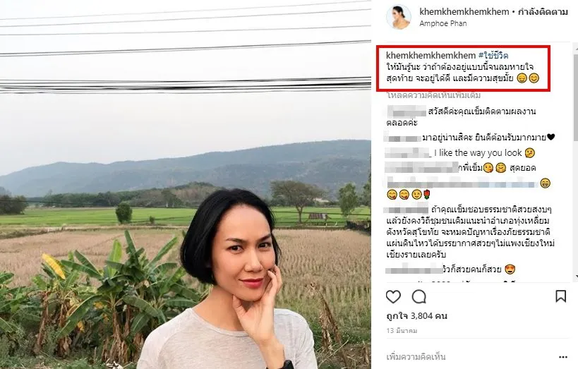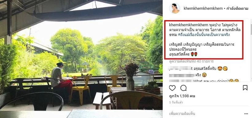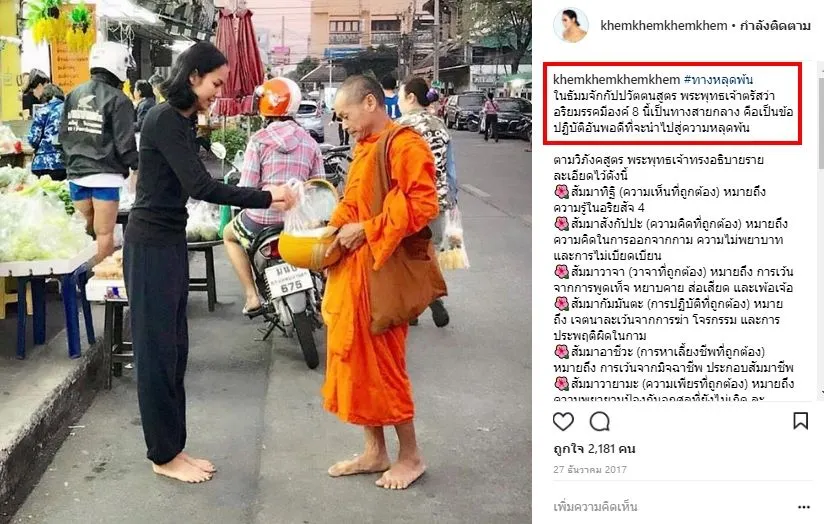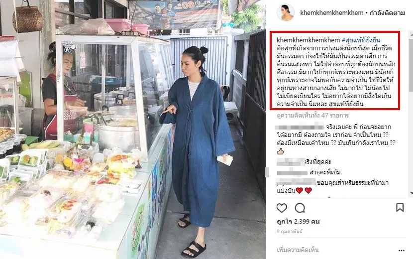 โดยเธอเคยได้ชี้แจ้งผ่านอินสตาแกรมว่า "#สุขแท้ที่ยั่งยืน คือสุขที่เกิดจากการปรุงแต่งน้อยที่สุด เมื่อชีวิตมันธรรมดา ก็จงใช้ให้มันเป็นธรรมดาเสีย การดิ้นรนแสวงหา ไม่ใช่คำตอบที่ถูกต้องนักบนหลักศีลธรรม มีมากไปก็ทุกข์เพราะหวงแหน มีน้อยก็ทุกข์เพราะอาจไม่พอกับความจำเป็น ใช้ชีวิตให้อยู่บนทางสายกลางเสีย ไม่มากไป ไม่น้อยไป ไม่เบียดเบียนใคร ไม่อยากได้อยากมีสิ่งใดเกินความจำเป็น นี่แหละ สุขแท้ที่ยั่งยืน"