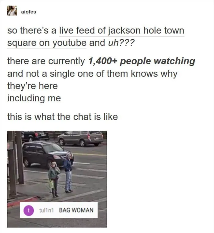นโลกอินเทอร์เน็ตมักมีกระแสอะไรแปลกๆ เกิดขึ้นอยู่เสมอ แต่คงไม่มีกระแสครั้งไหนที่แปลกไปกว่าการแห่กันไปชมสิ่งที่น่าเบื่ออย่างเช่นครั้งนี้ย้อนกลับไปในปี 2014 เมื่อชายท้องถิ่นคนหนึ่งในเมือง แจ็คสัน โฮล รัฐไวโอมิง ประเทศสหรัฐอเมริกา ได้ทำการถ่ายทอดสดสี่แยกแห่งหนึ่งภายในเมืองบนเว็บไซต์ยูทูป โดยมีจุดประสงค์เพื่อส่งเสริมการท่องเที่ยวและธุรกิจท้องถิ่นภายในเมืองบ้านเกิดของเขาแต่ในช่วงเดือนกันยายน 2016 ไม่มีใครทราบว่า ทำไมการถ่ายทอดสดที่สี่แยกอันแสนน่าเบื่อในเมืองแจ็คสัน โฮล ถึงกลายเป็นกระแสบนโลกออนไลน์ได้ เมื่อจู่ๆ ก็มีผู้เข้าชมการถ่ายทอดสดเพิ่มมากขึ้น มากขึ้นในแต่ละวัน ชาวเน็ตคนหนึ่งที่เพิ่งพบการถ่ายทอดสดนี้กล่าวว่า