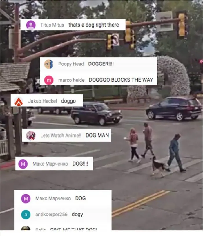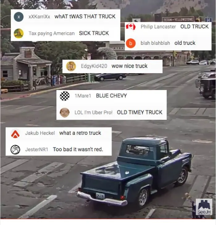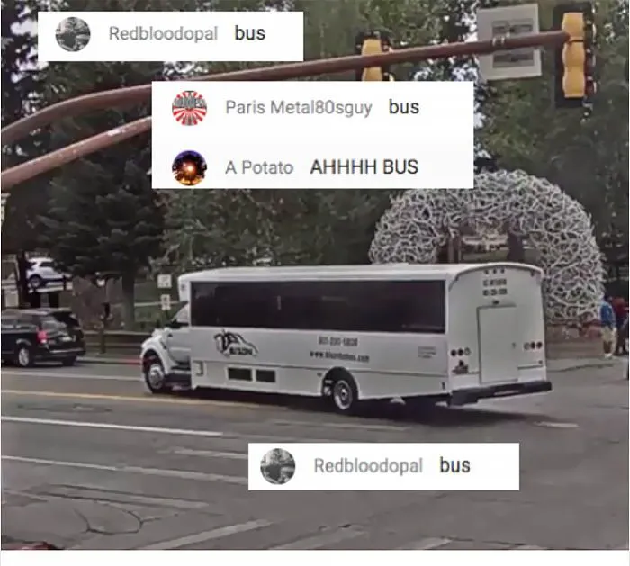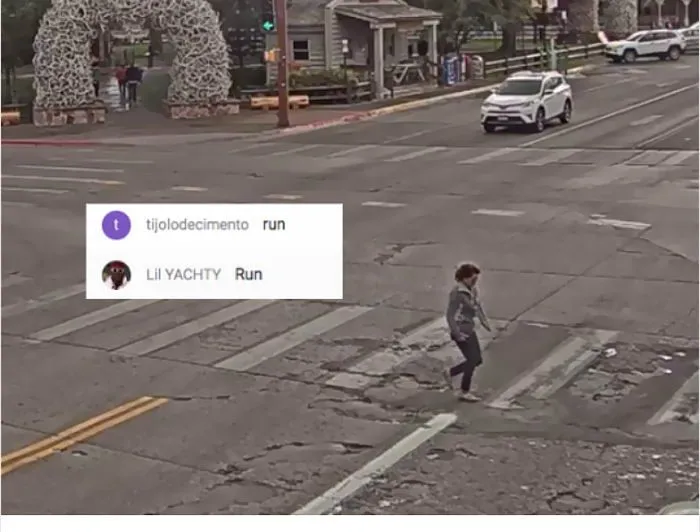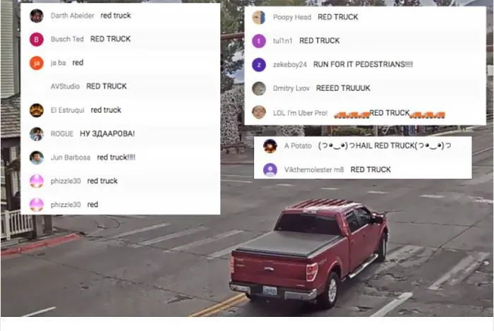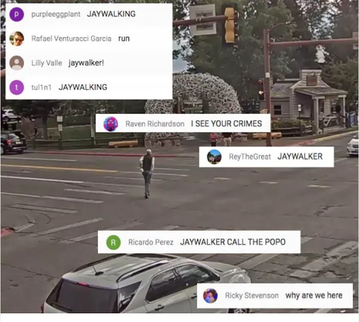 “มีผู้คน 1,400+ คน กำลังดูการถ่ายทอดสดนี้อยู่ และไม่มีใครสักคนที่รู้ว่าทำไม แต่พวกเขาอยู่ที่นี่ รวมถึงฉันด้วย และนี่คือสิ่งที่ผู้คนพูดกันในแชท”ทุกครั้งที่มีอะไรผ่านเข้ามา ก็จะมีคนพิมพ์เกี่ยวกับสิ่งนั้น ไม่ว่าจะเป็นผู้หญิงถือกระเป๋า หรือรถเมล์