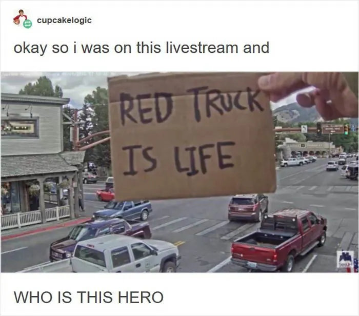 ชายคนนี้ดูการถ่ายทอดสดอยู่ดีๆ แล้วก็เจอคนถือป้าย “กระบะแดงคือชีวิต” โผล่ขึ้นมาบนจอ นี่ถือเป็นเรื่องตื่นเต้นที่สุดที่เคยเกิดขึ้นบนสี่แยกแห่งนี้