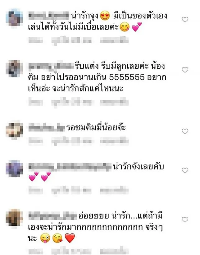 อุ๊ยตาย ว้ายกรี๊ด แรงมากค่ะ! จัดว่าแรงจนสาวคิมเงิบไปเลย ไม่รู้ว่าหวานใจในเวลานี้อย่างหมาก ปริญ จะสะดุ้งสะเทือนหรืออยากมีอยากได้บ้างอ๊ะเปล่า เพื่อนในแก๊งอย่าง มาร์กี้ ราศรี ก็กำลังจะเป็นคุณแม่ในอีกไม่ช้าไม่นาน เอ้า! แฟนคลับลุ้นกันไป ยกขันหมากไปขอให้เรียบร้อยก่อน ค่อยรออุ้มเบบี๋แล้วกันนะ อิอิ