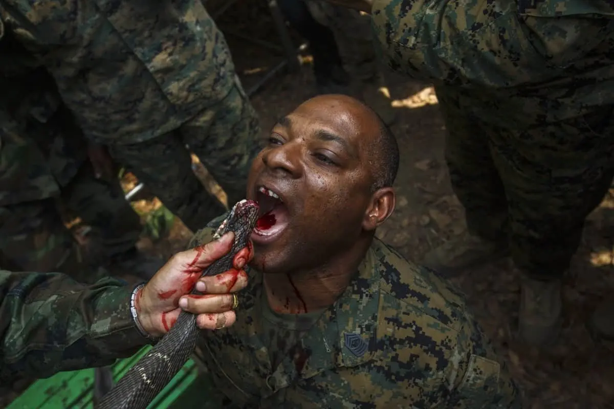 9. ในการฝึกของทหารไทยได้มีนาวิกโยธินอเมริกันเข้าร่วมการฝึกคอบร้าโกลด์ด้วย ซึ่งมีการฝึกการเอาตัวรอดในป่าลึก ด้วยการดื่มเลือดงูเห่า พี่ไทยโหดมาก