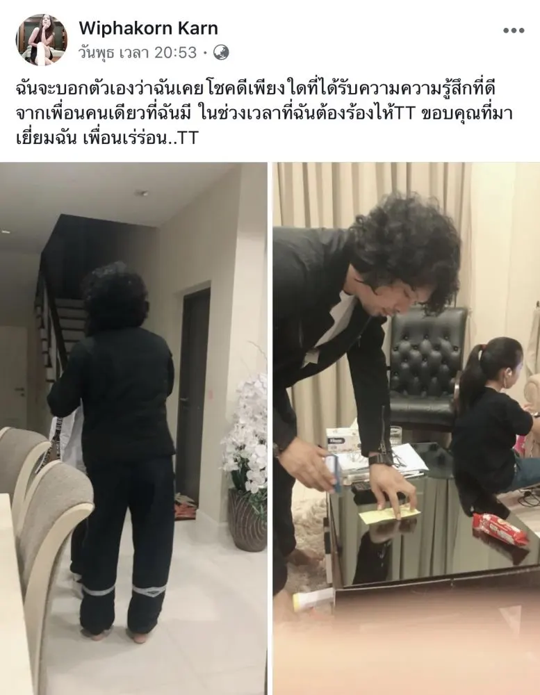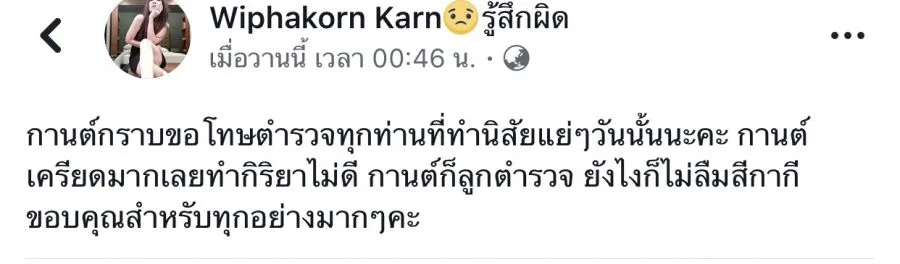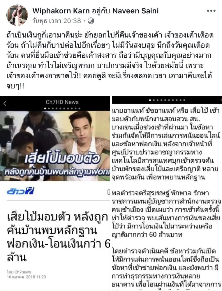 จากเพจ Wipha kornkarn ที่เธอใช้ ล่าสุดกานต์เธอได้โพสต์ข้อความตัดพ้อเรื่องเงินที่เสี่ยโป้ยืมไป แต่เสี่ยโป้ตอนนี้ถูกจับกรณีฟอกเงิน จากการทำธุรกิจการพนันออนไลน์ จนทำให้กานต์บอกว่า ถ้าเป็นเงินของตน ก็ให้เสี่ยโป้เอามาคืนเสีย พร้อมกับโพสต์ภาพ เสก โลโซ ที่เข้ามาให้กำบังใจและดูแลตนในยามที่กำลังต้องการกำลังใจดังกล่าว