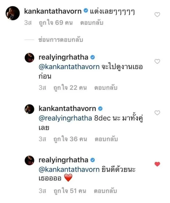 “(หัวเราะ) ยังค่ะ ช่วงนี้คนแต่งเยอะแล้วค่ะ ขอไปงานคนอื่นก่อนแล้วกัน ตอนนี้ความรักแฮปปี้ดีค่ะ คบกันมาปีกว่าๆแล้ว ปีหน้าก็จะสองปีแล้ว”