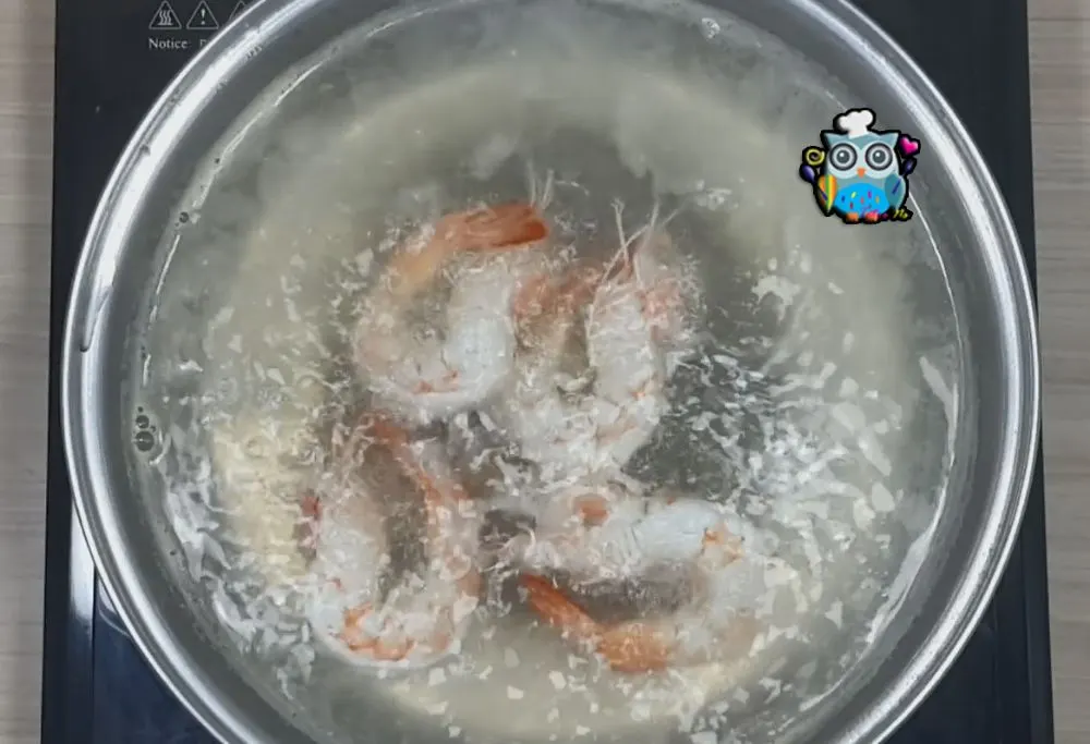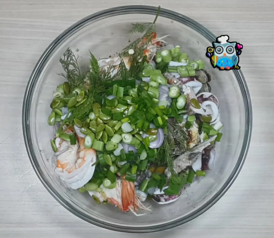 2.ตั้งน้ำลวกกุ้ง ปลาหมึก หอยแมลงภู่ ตักขึ้นน๊อกน้ำเย็นพักให้สะเด็ดน้ำ ทอดปลาทูหรือใช้ปลาทูย่างก็ได้ จากนั้นแกะเอาเฉพาะเนื้อ