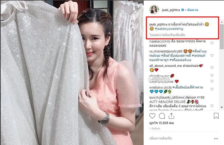 ล่าสุด สาวเจี๊ยบได้โพสต์ภาพลงในอินสตาแกรมส่วนตัว พร้อมระบุข้อความว่า “มาเลือกผ้าต่อไม่รอแล้วน้า #jeabboyzwedding”
