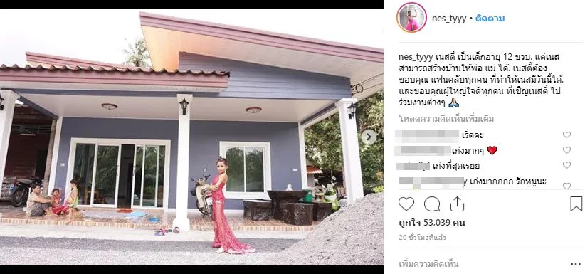 โดยล่าสุด น้องเนสตี้ สไปร์ทซี่ ได้เปิดภาพบ้านที่สร้างจากน้ำพักน้ำแรงของตัวเอง ด้วยวัยเพียงแค่ 12 ปีเท่านั้น ซึ่งได้ระบุข้อความไว้ว่า "เนสตี้ เป็นเด็กอายุ 12 ขวบ. แต่เนสสามารถสร้างบ้านให้พ่อ แม่ ได้. เนสตี้ต้องขอบคุณ แฟนคลับทุกคน ที่ทำให้เนสมีวันนี้ได้. และขอบคุณผู้ใหญ่ใจดีทุกคน ที่เชิญเนสตี้ ไปร่วมงานต่างๆ"